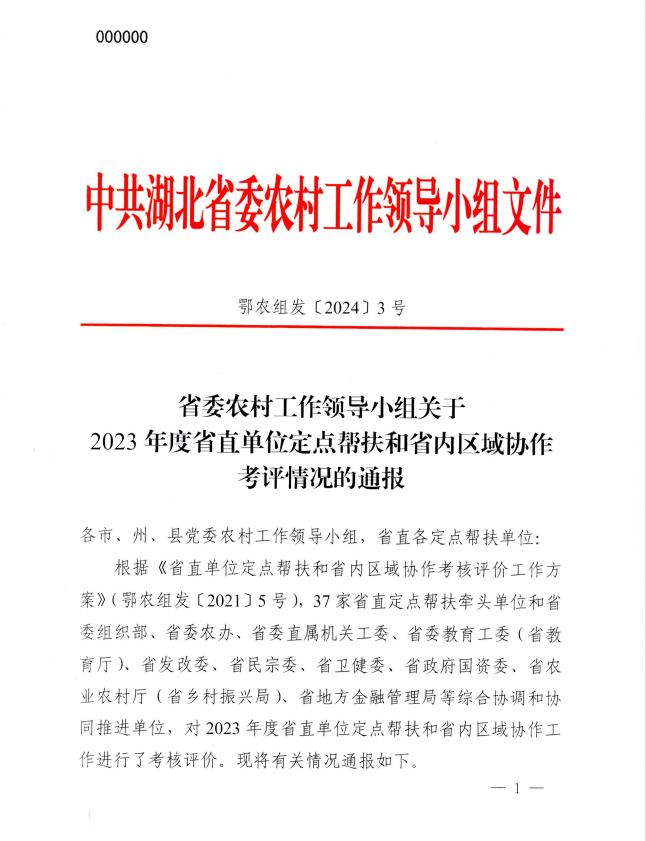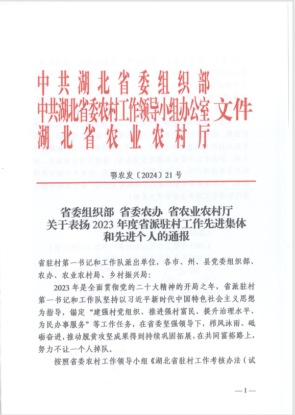 同時,省農業農村廳印發的省委組織部、省委農辦、省農業農村廳《關于表揚2023年度省派駐村工作先進集體和先進個人的通報》(鄂農發[2024]21號),湖北清能投資發展集團有限公司榮獲“2023年度工作突出派出單位”
